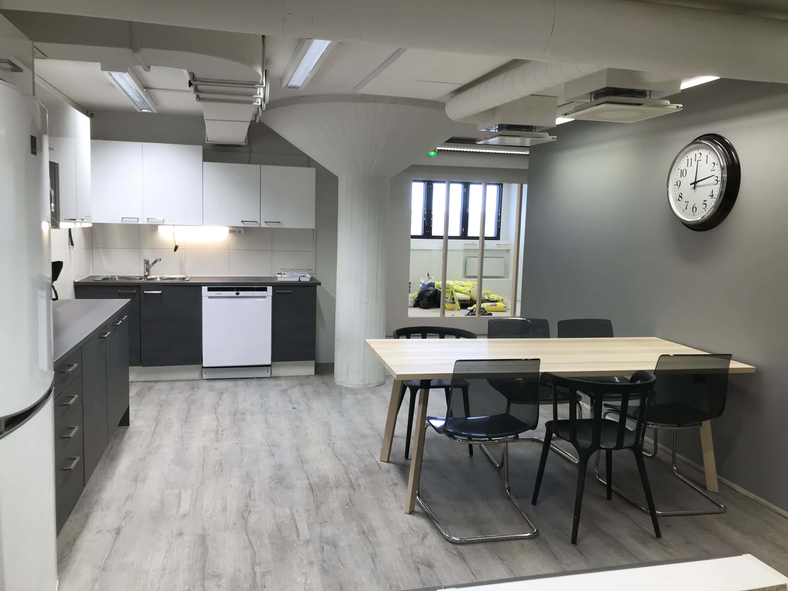 Kerroksessa keittiö, aula, wc-tilat ja neukkari yhteiskäytössä.